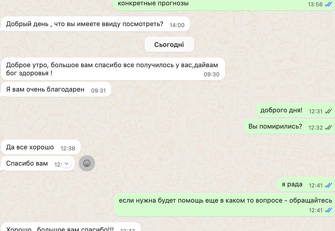 Я дуже ціную довіру людей до мене і повна конфіденційність звернення — один із основних моїх принципів роботи, адже збереження магічної таємниці — необхідна умова для отримання ефективного результату. Звертаючись до мене — можете бути певні, все залишиться тільки між нами. Але досить багато людей хотіли б прочитати відгуки про роботу спеціаліста, до якого вони звертаються, і це абсолютно нормально. Тому публікую деякі відгуки вдячних людей, з урахуванням конфіденційності їх особистого життя.